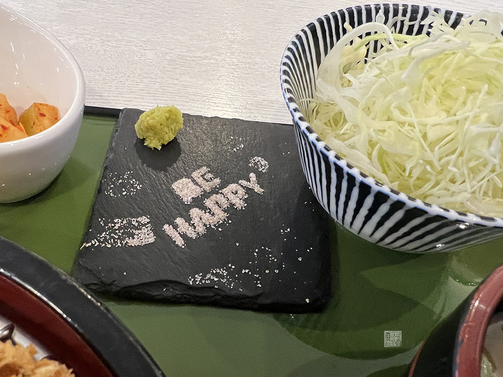 유리카모메에서 주문한 등심 카츠 세트는 기본적으로 제공되는 돈카츠와 함께 밥, 된장국, 샐러드와 함께 핑크 소금과 와사비, 깍두기와 단무지뿐만 아니라 요구르트 하나도 후식 서비스로 받아볼 수 있었다. 특히, 핑크 소금이 놓인 게 그냥 소금이 뿌려진 게 아니라 특정 틀에 맞춰 'BE HAPPY'라는 글자에 맞춰서 뿌려진 부분이 재밌었다고 생각한다.