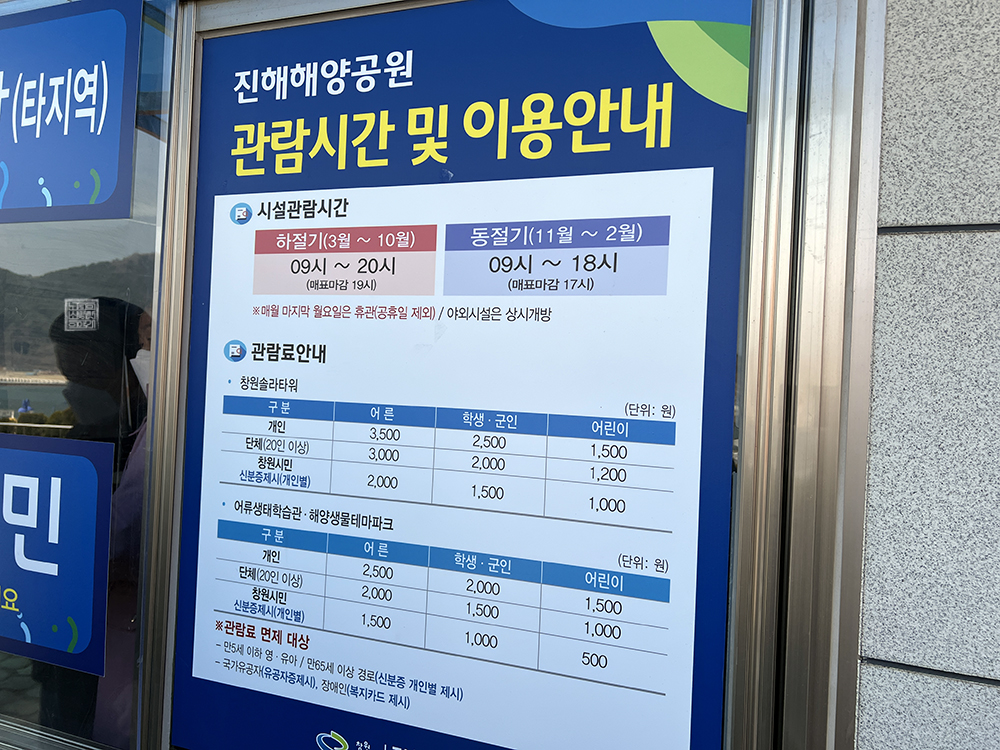 진해 해양 공원을 둘러보는 데에는 따로 비용이 들지 않는다. 그냥 차를 주차하는 주차비만 내면 되는데, 진해 해양 공원에 있는 창원 솔라 타워에 올라가 보거나 혹은 어류 생태 학습관과 해양 생물 테마 파크에 들어가고자 한다면 관람료를 지불할 필요가 있다. 하지만 이왕 여기까지 왔으면 전망대 정도는 올라가야 하지 않나 싶다.