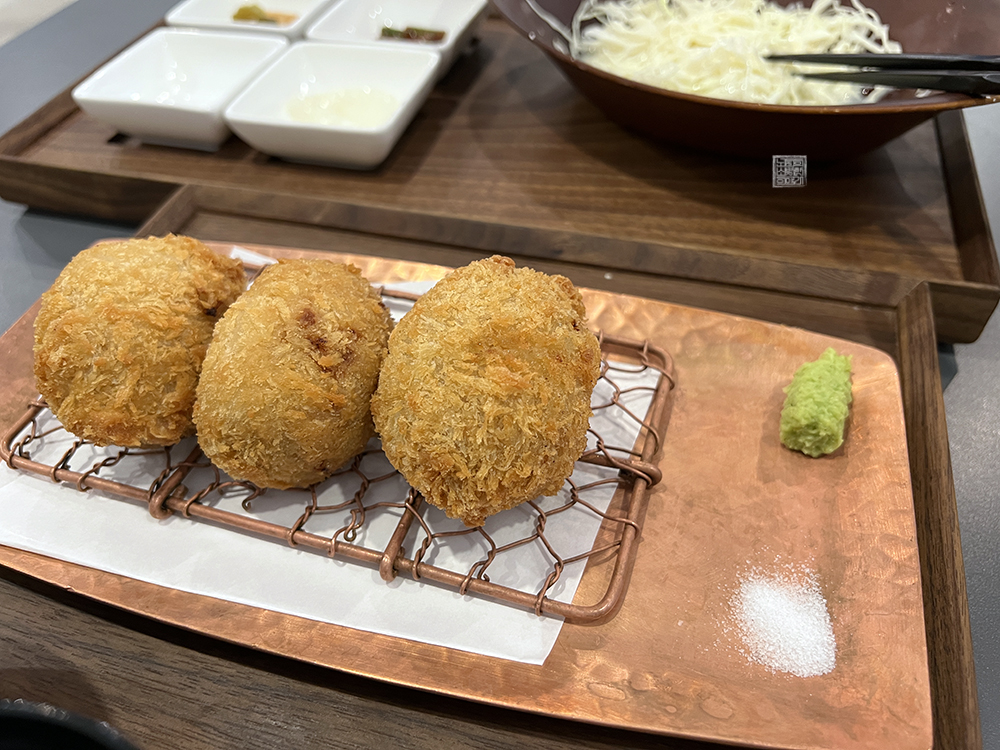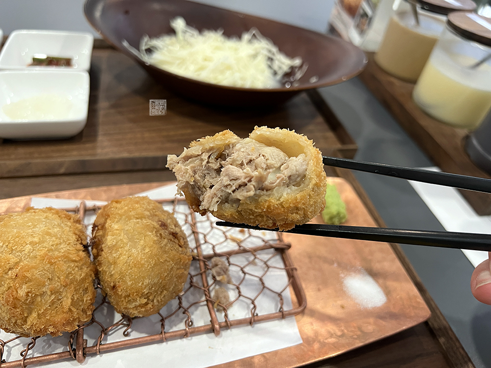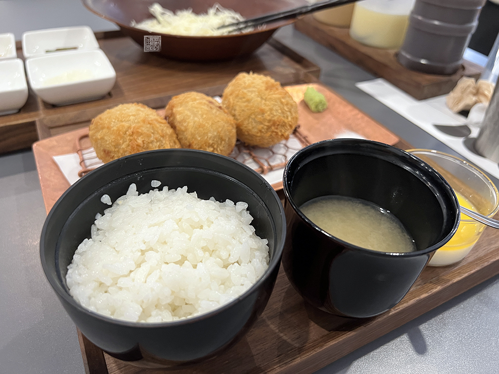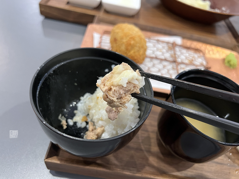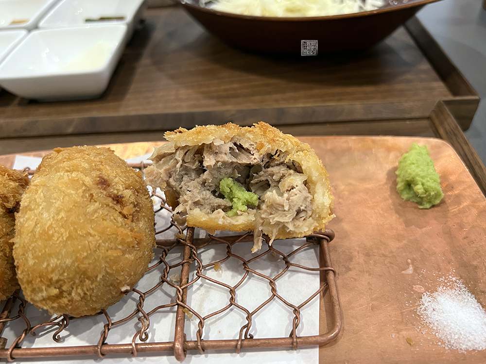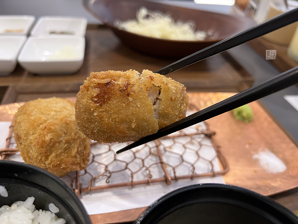 멘치카츠는 위 사진에서 볼 수 있는 것처럼 한입 베어 먹은 이후에 다진 고기 내부에 와사비를 넣어서 먹어도 맛있게 먹을 수 있다. 그리고 처음에는 '어? 치즈가 어디 있지?'라며 치즈를 찾았는데, 두 번째 조각부터는 카츠 내부에서 치즈가 적절히 녹았는지 한입 베어 먹을 때마다 쭉쭉 늘어나는 치즈를 눈으로 보면서 제대로 치즈의 맛을 즐길 수 있었다.