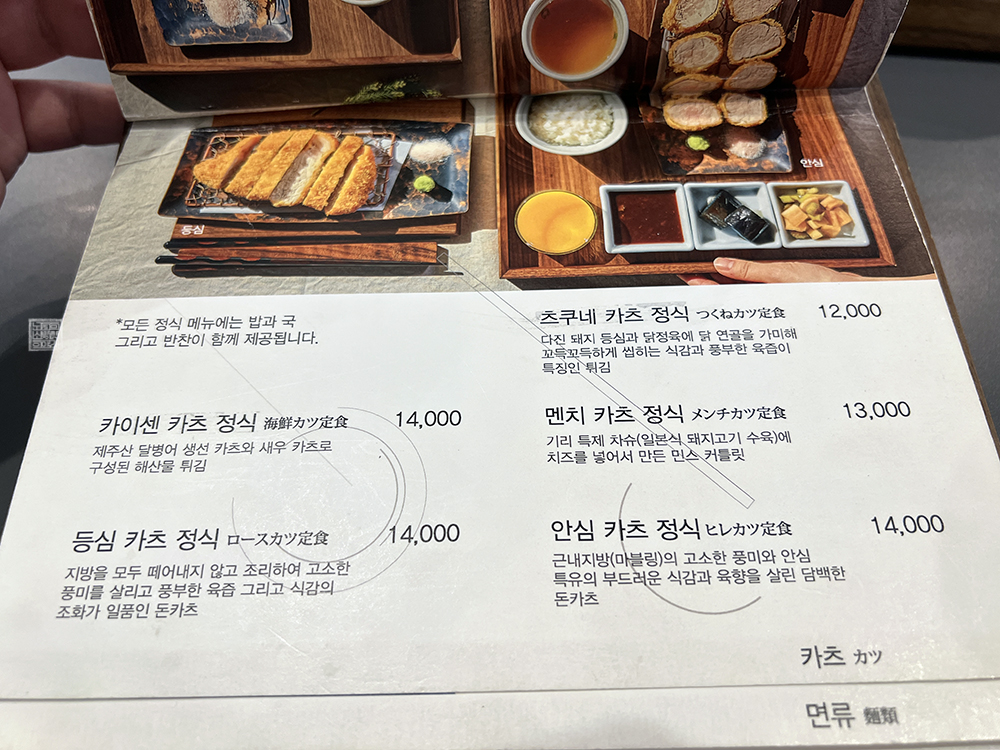 그래서 나는 이 멘치 카츠가 다른 돈가스 맛집에서 판매하는 치즈 돈가스에 해당한다고 생각해 이번에 주문해서 먹어보기로 한 것이었다. 다른 카이센 카츠 정식은 내가 먹지 않는 생선 카츠이기 때문에 먹을 생각이 없었고, 츠쿠네 카츠 정식은 연골이 들어가 있다고 해 나와 맞지 않을 것 같아 주문할 메뉴가 그리 많지 않았다.