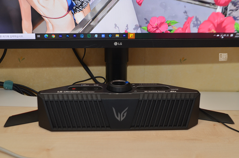 499,000원이 하는 LG 울트라기어 게이밍 스피커 GP9가 부담스러울 경우에는 299,000원에 구매할 수 있는 LG 울트라기어 게이밍 스피커 GP3가 딱이다. 다소 무리를 하기는 했어도 이 지름에 후회는 없었다. 내가 사용하는 LG 울트라게이밍 모니터의 발받침에 쏙 들어가는 디자인으로 제작되었기 때문에 책상 위에 놓아도 위화감이 전혀 없었다.