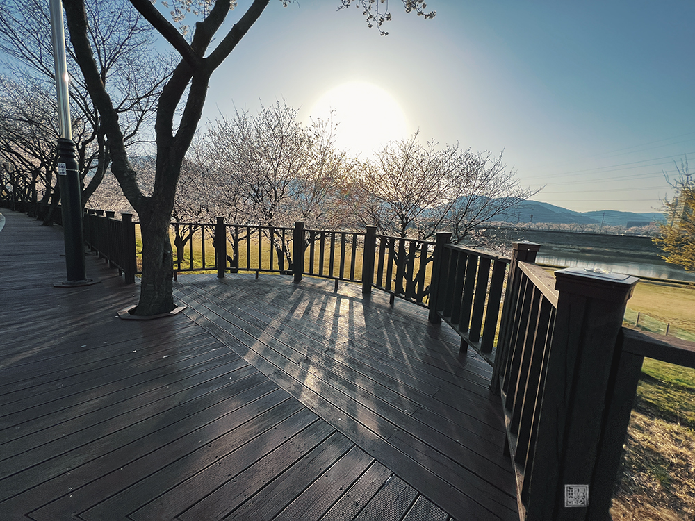 밀양 삼문동 벚꽃길은 강과 아파트 단지를 양옆으로 끼고 산책로와 함께 쭉 벚나무가 심어져 있는 길을 걸어볼 수 있는 길로, 주자창에 차를 주차하러 가는 순간에도 '와, 진짜 멋지다'라는 감탄이 나오는 그런 모습을 가지고 있다. 하지만 주차장에 차를 주차한 이후 볼 수 있는 풍경은 마치 그림 같아서 나도 모르게 입이 벌어졌다.