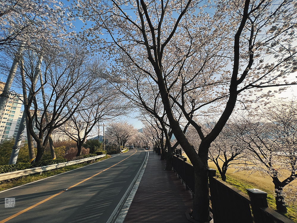 차를 주차한 이후 볼 수 있었던 밀양 삼문동 벚꽃길의 모습은 마침 해가 기울기 시작한 시간이라 더욱 그 풍경이 두드려졌다. 흔히 사진은 빛을 활용한 예술이라고 말하는데… 딱 오후 5시가 넘어간 당시에는 굳이 우리가 빛의 양과 구도를 생각할 필요 없이 그냥 스마트폰을 꺼내서 스마트폰 카메라로 찍는 순간 예술이 되는 듯한 느낌이었다.