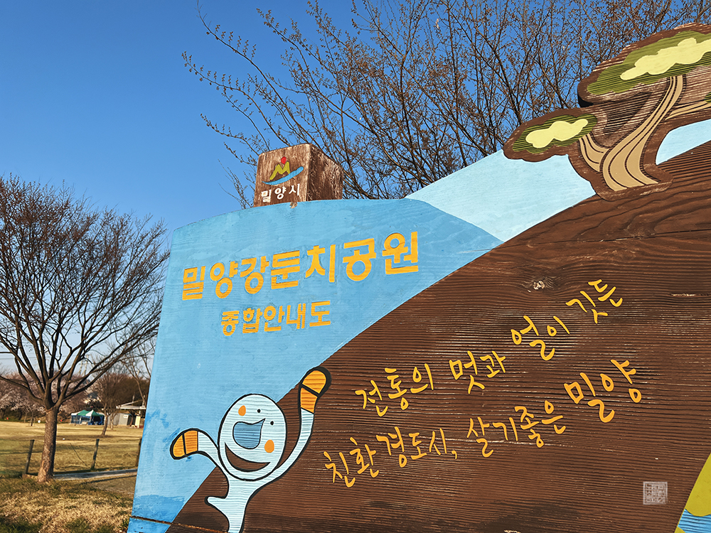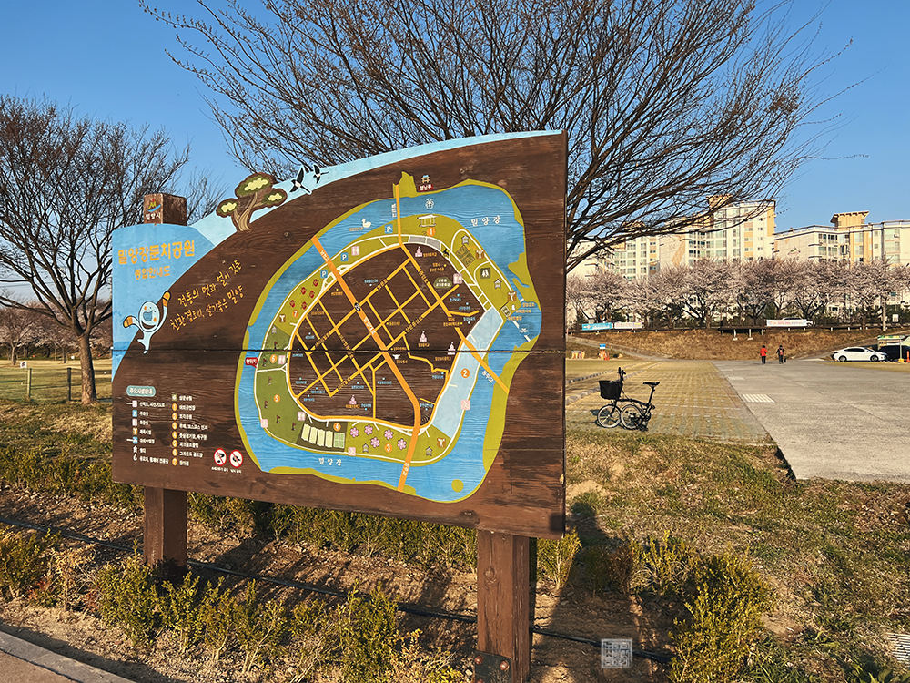 한쪽 산책로를 따라 내가 걸을 수 있는 만큼 걸은 이후 잠시 휴식을 취하다 다시금 주차장으로 갈 때는 차도를 낀 산책로가 아니라 강을 낀 산책로를 따라 주차장으로 향했다. 밀양강을 낀 공원의 산책로는 양옆으로 벚꽃이 흐드러지게 핀 벚나무 아래를 걷는 것과 또 다른 모습을 볼 수 있어 걷는 재미가 있었다.