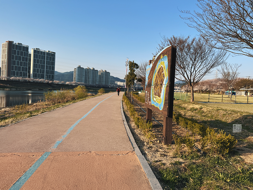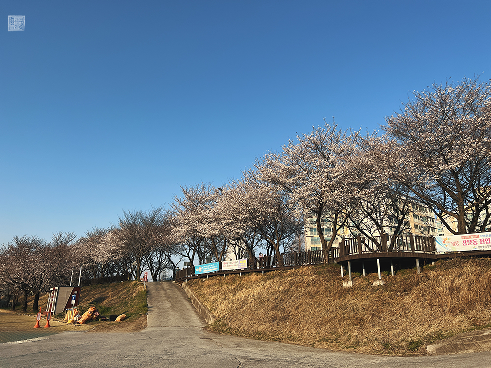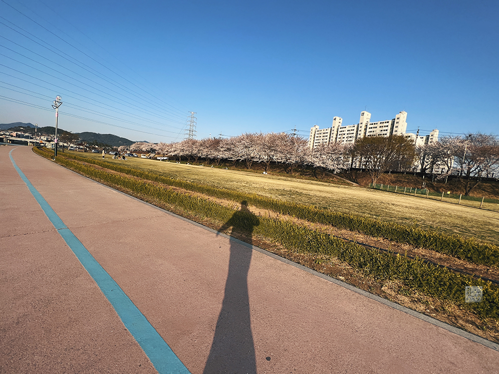 밀양 삼문동 벚꽃길은 강과 아파트 단지를 양옆으로 끼고 산책로와 함께 쭉 벚나무가 심어져 있는 길을 걸어볼 수 있는 길로, 주자창에 차를 주차하러 가는 순간에도 '와, 진짜 멋지다'라는 감탄이 나오는 그런 모습을 가지고 있다. 하지만 주차장에 차를 주차한 이후 볼 수 있는 풍경은 마치 그림 같아서 나도 모르게 입이 벌어졌다.