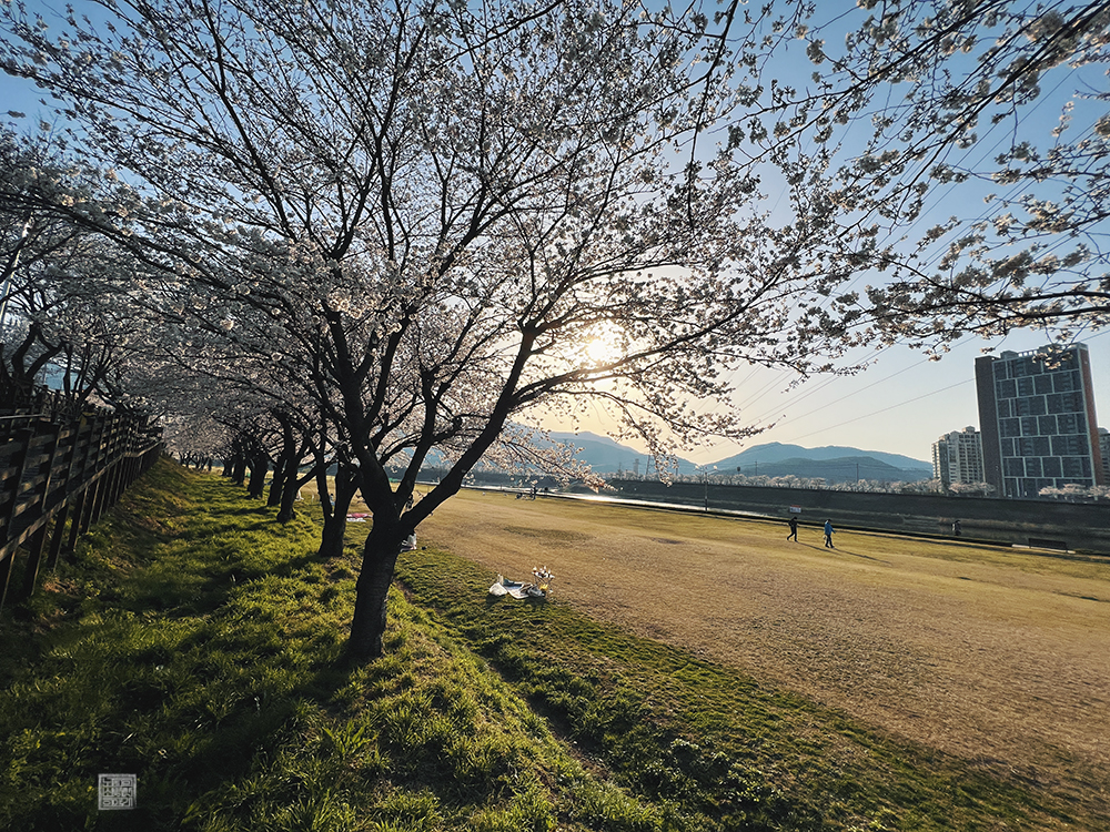 벚나무 아래에서 삼삼오오로 시간을 보내고 있는 사람들의 모습은 그림 같은 풍경을 자아냈다. 거기에 자연스럽게 거리두기(?)를 하고 있는 것처럼 일정한 간격으로 떨어져 있는 벚나무들이 기울고 있는 해의 빛을 받아 보여주는 모습은 누구나 다 무심코 스마트폰을 꺼내서 사진 한 장을 찍게 하는 놀라운 매력이 있었다고 생각한다.