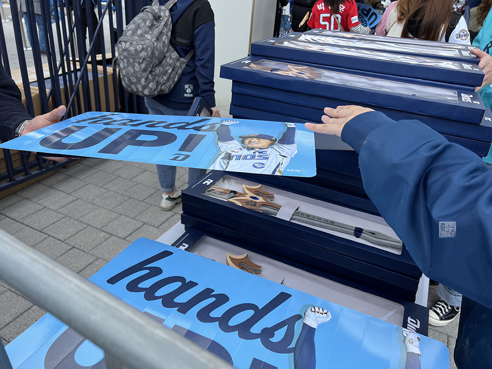 일찍 야구장에 도착해 주변을 둘러보며 사진을 찍거나 팀스토어를 찾아 여러 상품을 구경한 이후 정문 1번 게이트에서 줄을 서 있다가 12시를 맞아 곧바로 야구장에 입장을 했다. 당시 야구장을 찾은 팬들을 대상으로 NC 다이노스는 응원 도구 두 가지를 나눠주었는데, 하나는 쥘부채를 만드는 종이와 또 다른 하나는 집행검이었다.