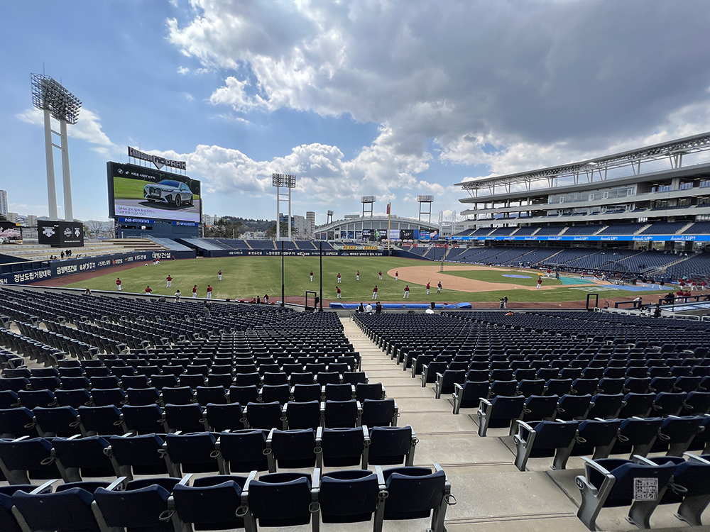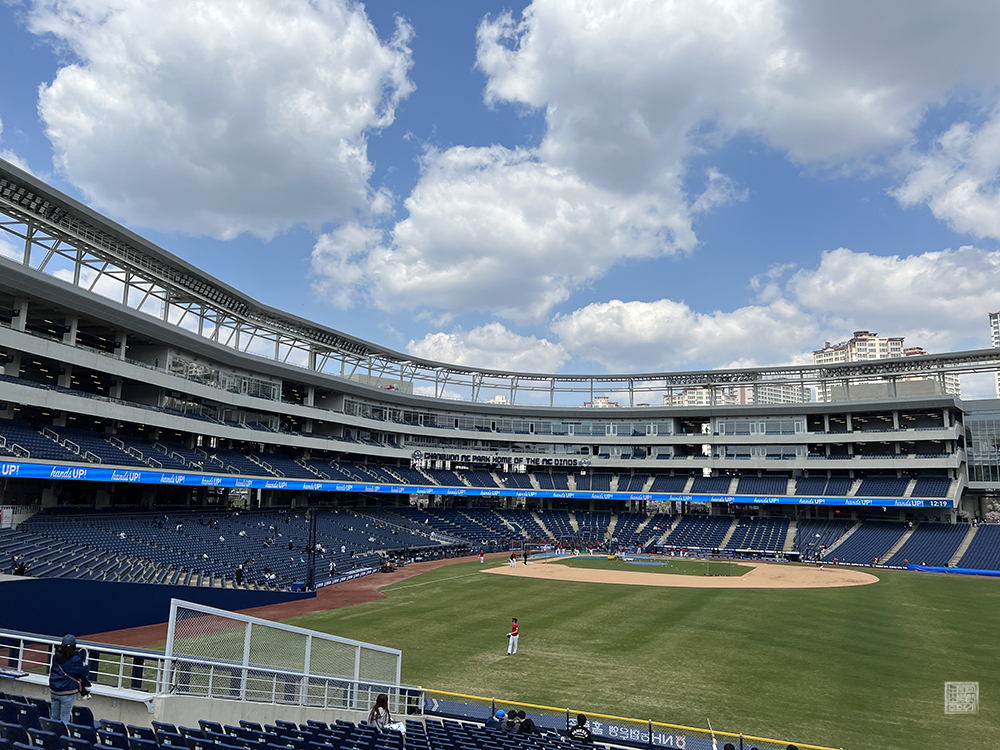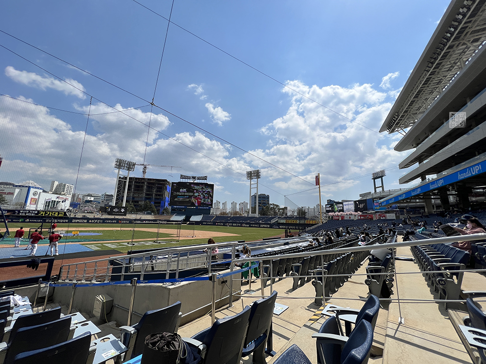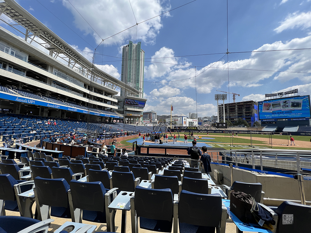 야구장 내부로 들어가니 SSG 랜더스 선수들이 몸을 푸는 모습을 볼 수 있었는데, 창원 NC 파크는 어디에 자리를 잡고 앉더라도 야구장을 한눈에 바라볼 수 있는 탁 트인 시야를 자랑하고 있기 때문에 어느 좌석에 앉더라도 야구를 실감나게 감상할 수 있다. 단, 특정 자리에 앉아야 치어리더와 선수들을 볼 수 있으니 참고하도록 하자.