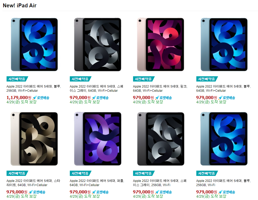 현재 쿠팡에서는 지난 4월 8일(금)부터 아이패드 에어 5세대 사전 예약 주문을 받고 있는데, 이번 아이패드 에어 5세대 사전 예약은 기존에 공개가 되었던 아이폰 SE3 사전 예약과 달리 카드 할인을 최대 8%만 받을 수 있다. 원래 스마트폰과 태블릿PC의 사전 예약은 다소 가격 할인 차이가 있었는데 이번에도 그 정도의 수준이었다.