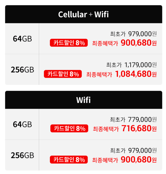 한국 같은 경우는 많은 사람이 스마트폰을 무제한 요금제를 사용하거나 어디를 가더라도 와이파이를 이용할 수 있기 때문에 굳이 셀룰러 모델을 구매하기 보다 카드할인 8%를 받아서 최종 혜택가 90만 원에 구매할 수 있는 아이패드 에어 5세대 256GB 와이파이 모델을 구매하는 게 훨씬 이득이라고 생각한다. 뭐, 최종적인 판단의 당신의 몫이다.