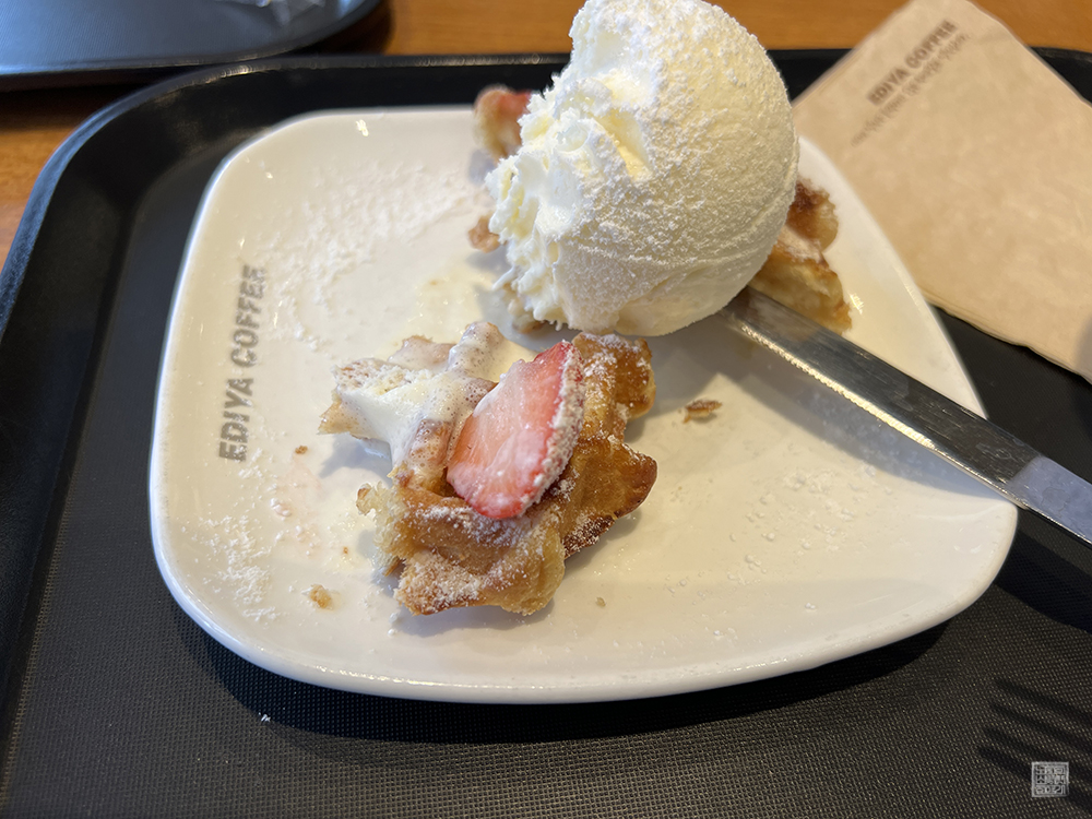 와플의 맛은 평범히 맛있게 먹을 수 있는 와플이었다고 생각한다. 이제 막 갓 구워서 혹은 마무리 작업을 해서 나온 따끈따끈한 와플이라 이건 맛이 없을 수가 없었다. 와플 위에 올려진 바닐라 아이스크림과 함께 와플을 함께 먹는 건 최고의 조합이 따로 없었는데, 이 조합을 최초로 생각한 사람은 과연 돈을 얼마나 벌었을지 궁금하다.