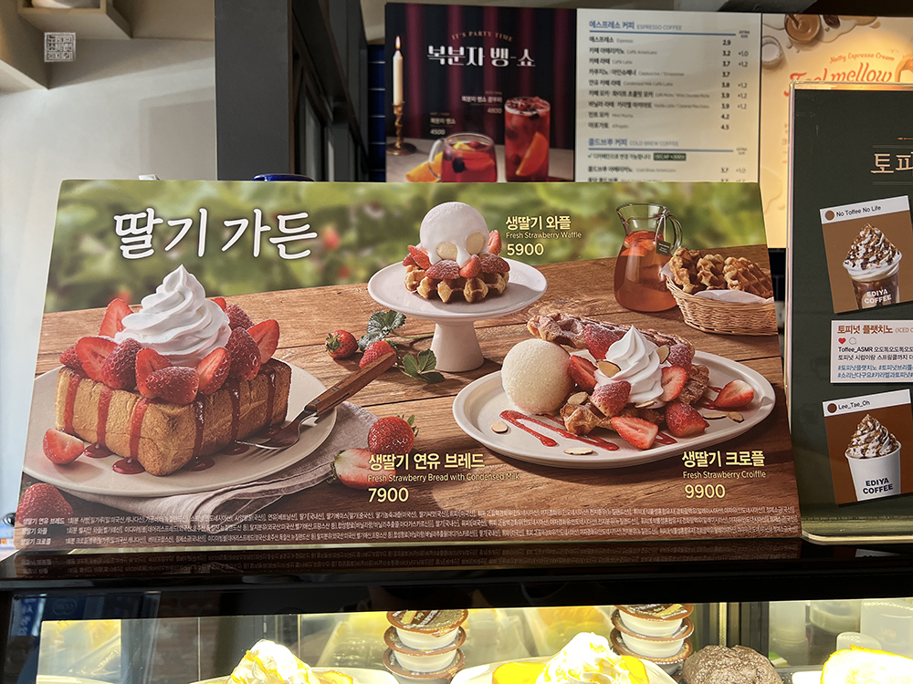 처음 이디야에 들어가서 주문할 때는 초코 쿠키 쉐이크만 주문하려고 했지만, 주문을 하기 위해서 카운터 앞에 서니 옆에 있는 딸기 가든 배너가 눈에 들어왔다. 평소에는 카페 근처를 지나갈 때마다 입간판으로 보기만 했던 그 딸기 디저트의 모습을 이렇게 가까이서 눈으로 보니 도저히 참을 수 없어 디저트를 하나 주문하기로 했다.