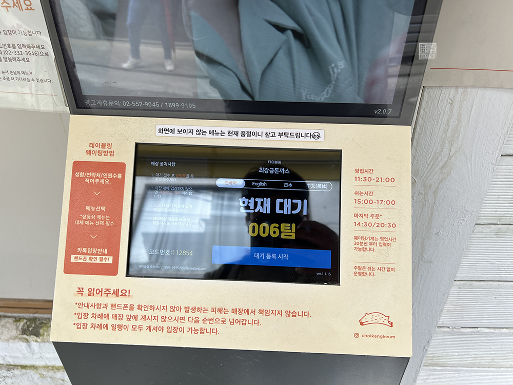 가게에 도착했을 때 역시 소문난 돈까스 맛집답게 벌써 사람들이 오픈 시간이 되기 전부터 기다리고 있는 모습을 볼 수 있었다. 살짝 불안한 나는 얼른 대기줄 포스기를 이용해서 예약을 했는데, 다행히 나는 대기번호 6번이 되어 그렇게 기다리지 않고도 금방 최강금 돈까스 가게 내부로 들어가서 맛있는 돈까스를 먹을 수 있을 것 같았다.