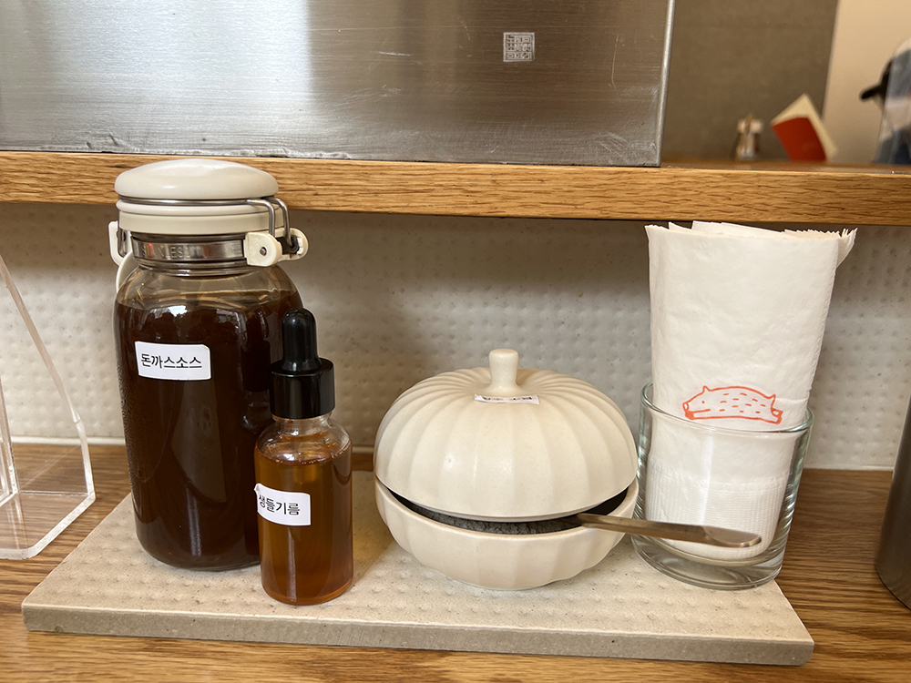 최강금 돈까스에 들어가서 테이블에 앉으면 앞에 소금을 비롯해서 돈까스 소스, 들기름이 들어가 있는 병 등이 놓여 있는 것을 알 수 있다. 처음에는 돈까스를 먹는 데에 왜 들기름이 있는지 이해할 수 없었는데, 최강금 돈까스에서는 맛있게 먹는 방법으로 들기름과 소금을 섞어서 만든 기름장에 돈까스를 찍어 먹는 것을 추천하고 있었다.