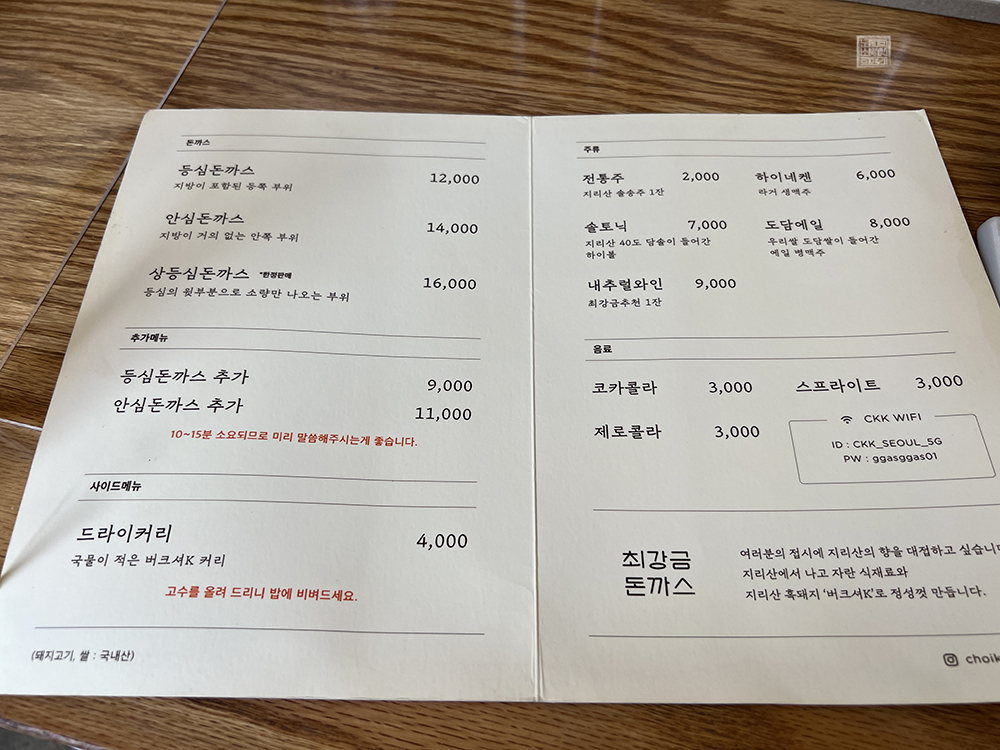 최강금 돈까스에서 주문할 수 있는 메뉴는 간단하다. 돈까스 종류는 등심돈까스, 안심돈까스, 상등심돈까스 세 개가 있고(치즈돈까스는 판매하지 않는다), 추가 메뉴로 돈까스만 추가할 수 있는 메뉴와 함께 카레를 추가할 수 있는 드라이커리 메뉴가 사이드 메뉴로 있다. 나머지는 모두 주류 혹은 음료로 구성되어 있었다.