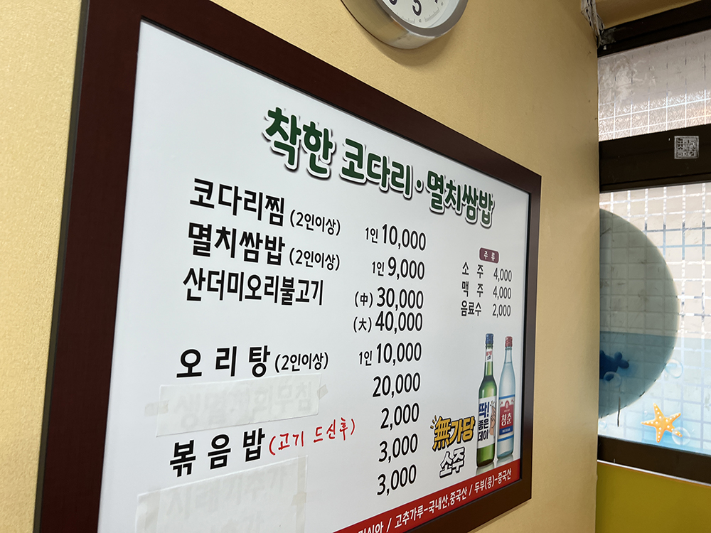 가게 이름이 '착한 코다리 멸치쌈밥'이라고 해도 이곳에서 판매하는 건 두 개의 메뉴만 아니라 산더미 오리 불고기와 오리탕도 함께 판매하고 있다. 가게의 테이블은 평소 한잔을 하러 오는 손님들이 많은 덕분인지 기본적으로 소주잔과 맥주잔 등이 비치되어 있었는데, 당시 가게를 찾았을 때도 제법 사람들이 술을 즐기는 모습을 볼 수 있었다.