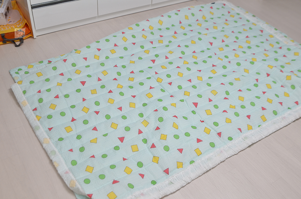이불 패드는 뒷면에 미끄럼 방지 도트 원단이 사용되어 있기 때문에 나처럼 바닥에서 사용하더라도 이불이 크게 미끄러지는 일은 없었다. 괜스레 힘을 주어서 이불을 옮기지 않는 이상 처음 패드를 깐 곳에서 패드가 딱히 움직이지는 않았는데, 마감 처리도 잘 되어 있는 데다가 무엇보다 사용된 패턴 무늬가 짱구 잠옷이다 보니 무척 마음에 들었다.