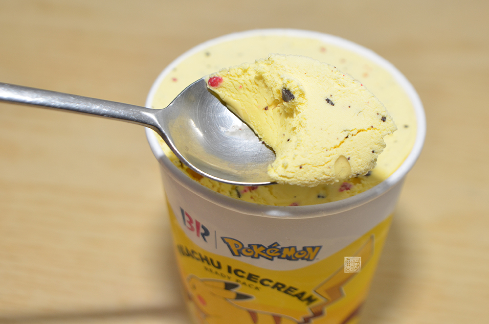 그런데 아이스크림을 본다면 단순히 바나나 아이스크림으로 채워져 있는 게 아니라 우리가 포켓몬스터 피카츄에서 볼 수 있는 검은색과 빨간색의 무언가도 함께 들어가 있다는 걸 알 수 있다. 검은색은 초콜릿 후레이크로 채워져 있고, 빨간색은 레드 팝핑 캔디가 들어가 있어 아이스크림을 먹을 때마다 입에서 팡팡 터지는 식감을 즐길 수 있다.