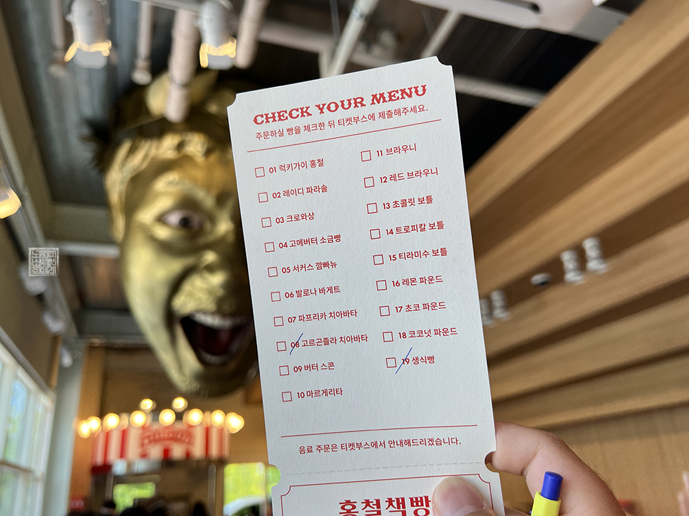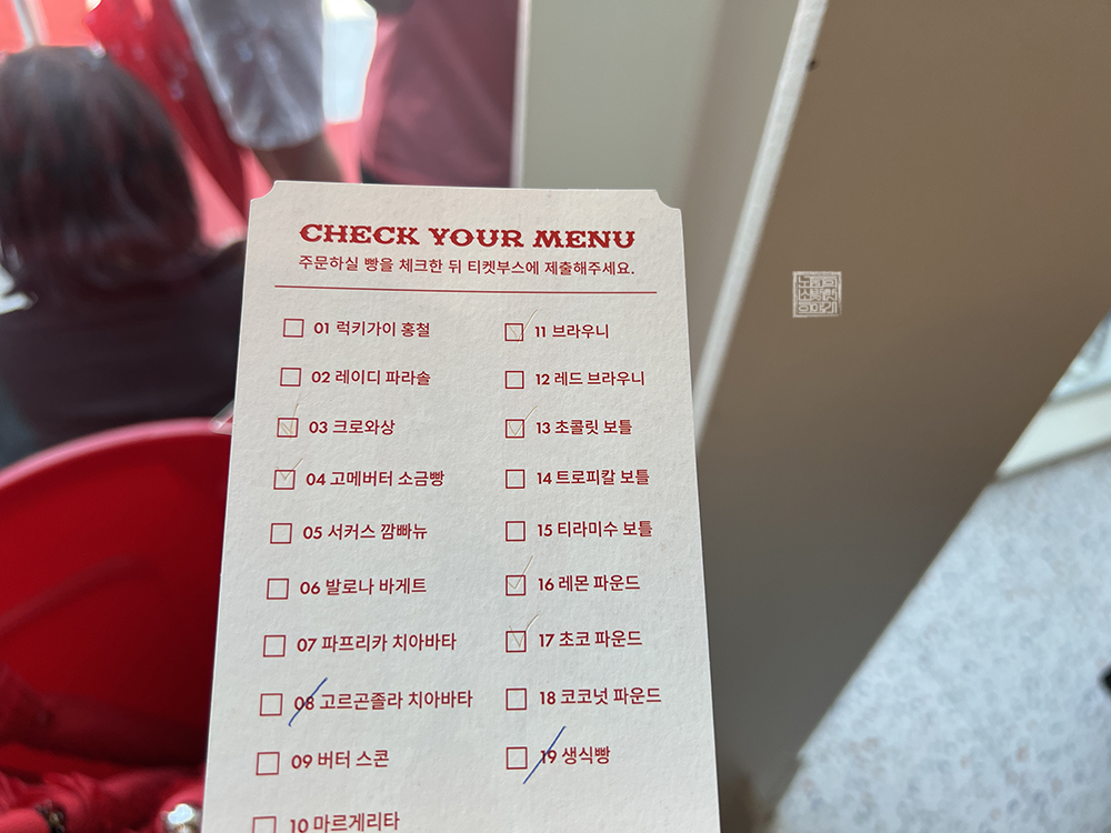 뭔가 이렇게 빌지에 구매하고 싶은 빵을 체크한 이후 곧바로 카운터에서 계산을 하고, 옆으로 이동해서 빵을 받아가는 형태인데도 생각보다 순환율은 빠르지 않았다. 하지만 직접 구매할 빵을 쟁반에 담아서 카운터에 줄을 서서 일일이 개별 포장과 계산을 하는 것보다는 빠른 건 분명했다. 올 것 같지 않던 내 차례가 어느새 눈앞으로 다가왔다.