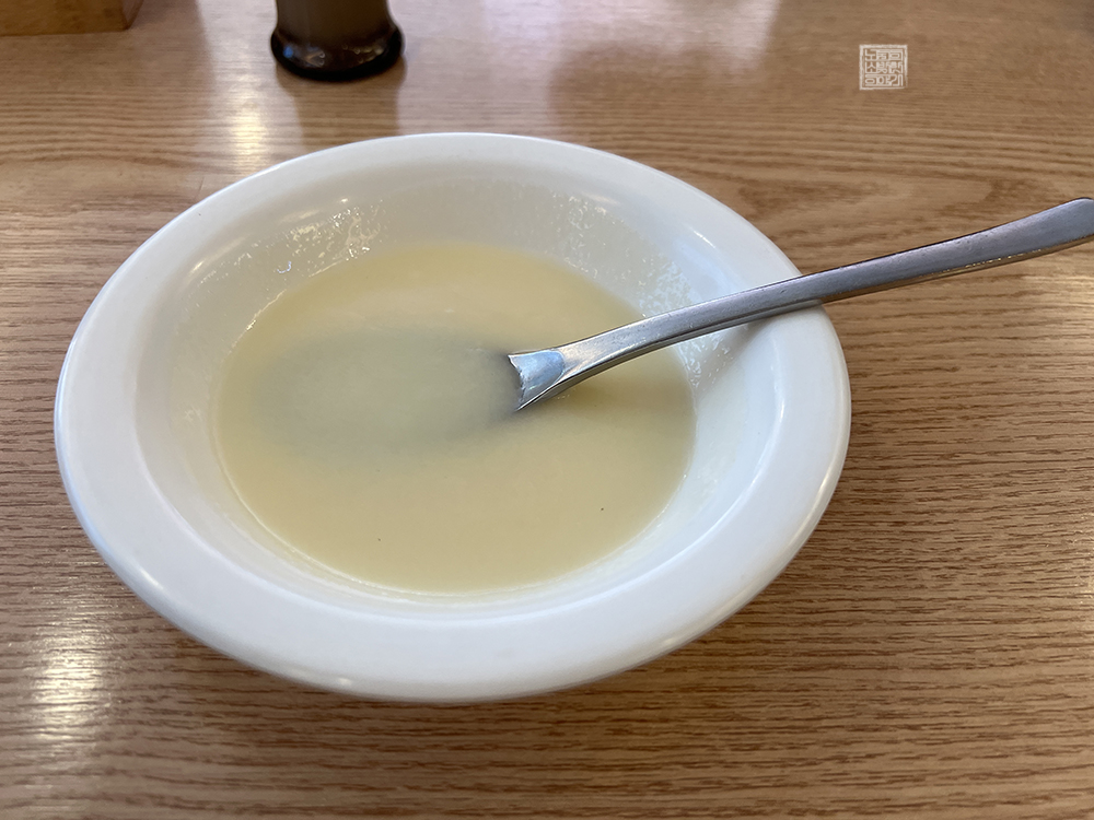 수제 돈까스 무무에서는 포스기를 이용해서 주문과 결제를 한 이후 자리에 앉으면 바로 위 사진에서 볼 수 있는 어디서나 볼 수 있는 흔해 빠진 크림스프를 먼저 받아볼 수 있다. 보통 조금 있는 맛집이나 혹은 최근에 운영되는 돈까스 맛집에서 받아볼 수 있는 크림스프는 그래도 파슬리나 이런 게 뿌려지기 마련인데 여긴 그렇지 않았다.