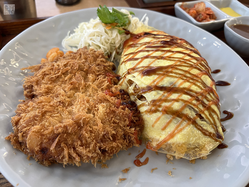 그냥 수제 무무 돈까스를 주문한다면 돈까스가 2장이 나오지만, 수제 돈까스 오므라이스 세트를 주문하면 돈까스 한 장과 오므라이스를 받아볼 수 있다. 나는 어릴 적에 분식점이나 옛날 돈까스집에서 항상 오므라이스와 돈까스를 먹었기 때문에 무무 돈까스가 아니라 수제 돈까스 오므라이스 세트를 주문했다.