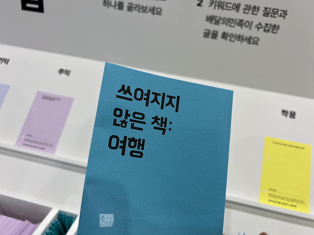 전시관 한쪽에는 제법 큰 규모로 부스를 만들어 놓은 배달의 민족 부스가 자리잡고 있다. 도서전에 왜 배달의 민족 부스가 있는 건지 의아했는데, 해당 부스에서는 직접 특정 키워드를 주제로 글을 써볼 수 있는 공간이 마련되어 있었다. 이곳에서 글을 쓴 이후 제출을 한다면 배달의 민족에서 사용할 수 있는 할인 쿠폰을 받을 수 있다.