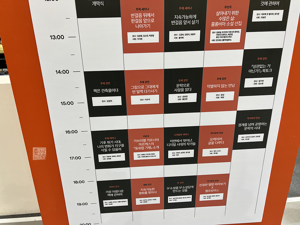 서울 국제 도서전에서는 출판사가 판매하는 책들만 아니라 도서전이기에 들어볼 수 있는 다양한 강의도 준비되어 있다. 현장에 오기 전에 미리 어떤 강의와 프로그램이 있는지 파악한 이후 사전 예약을 한 이후에 강의를 들어보는 것도 좋지만, 현장에서 우연히 내가 관심이 있는 주제의 프로그램을 만나서 들어보는 것도 나쁘지 않다고 생각한다.