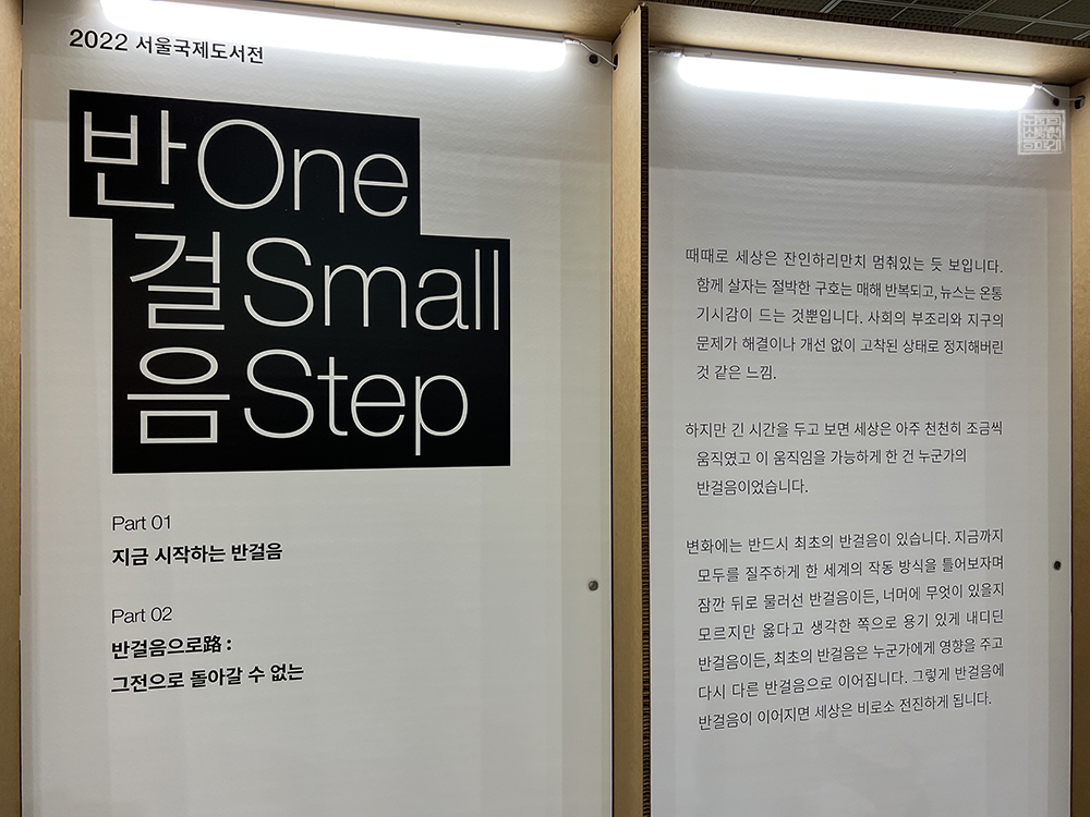 그리고 서울 국제 도서전이 열리고 있는 전시관의 중앙으로 발걸음을 옮긴다면 오는 2022 서울 국제 도저선의 주제 '반걸음'을 가지고 전시되어 있는 여러 책을 둘러볼 수 있다. 여기서 볼 수 있는 책들은 모두 특정 주제로 묶인 책들로, 관람객의 입장에서 천천히 걸어 보면서 평소 관심이 있었던 주제 혹은 없었던 주제의 책을 만나볼 수 있다.
