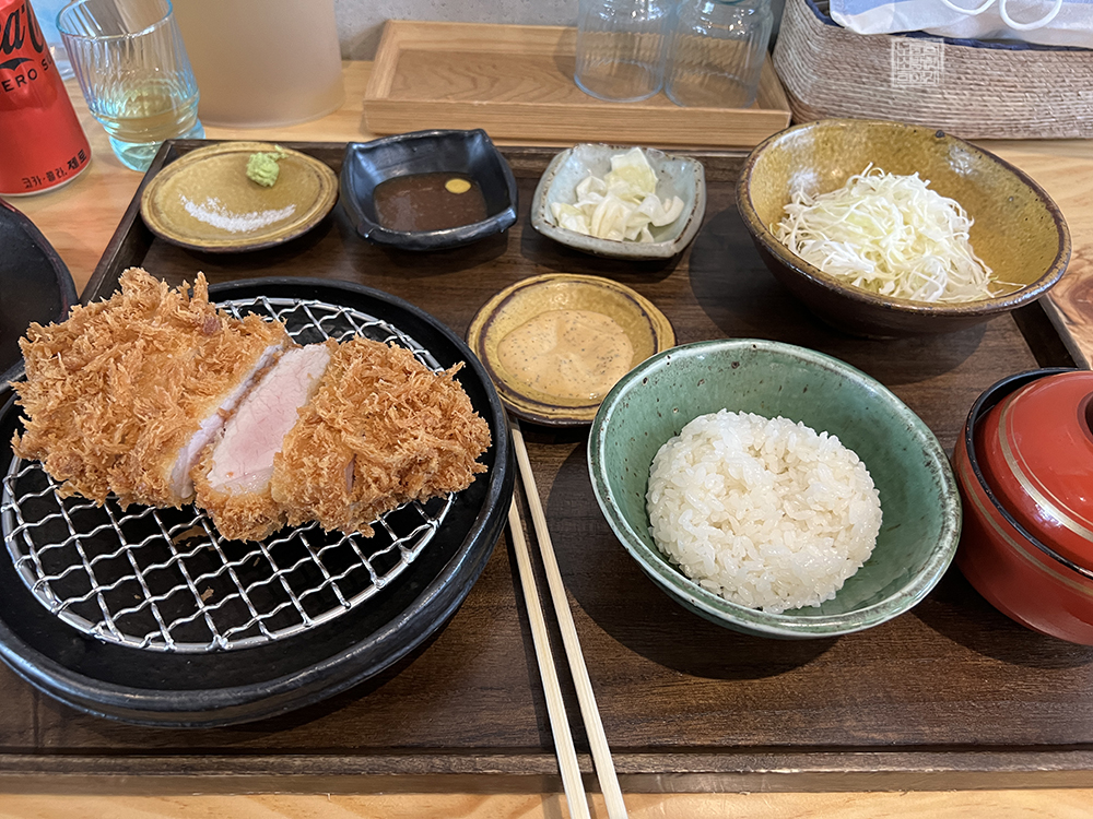 내가 종종 돈가스를 먹으러 가는 부산의 돈가스 맛집도 이 가격에서 2~3천 원밖에 차이가 나지 않기 때문에 조금만 더 맛있는 음식을 먹는 데에 돈을 쓴다고 생각하면 된다. 여기서 내가 주문한 건 로스카츠 정식(밥+국+카츠+양배추 구성)과 함께 간단히 곁들일 치킨 가라아게 3조각, 그리고 제로콜라 한 개 구성으로 총합 23,500원이 들었다.