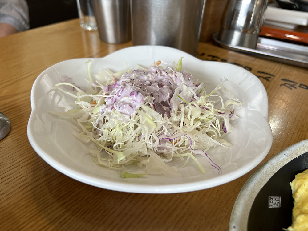 김해 삼계 김치찜 맛집 한성 김치찜 본점의 반찬 구성은 그렇게 많지 않다. 메인 메뉴인 김치찜을 중심으로 해서 계란말이 하나, 양배추 샐러드 하나, 오뎅 반찬, 두부, 콩나물, 김, 고추 장아찌 등으로 구성되어 있다. 원래 밥은 고봉밥 형태로 나오는 데 당일 비슷한 시각에 갑자기 단체 손님이 오는 바람에 밥의 양이 부족해서 조금만 나왔다.