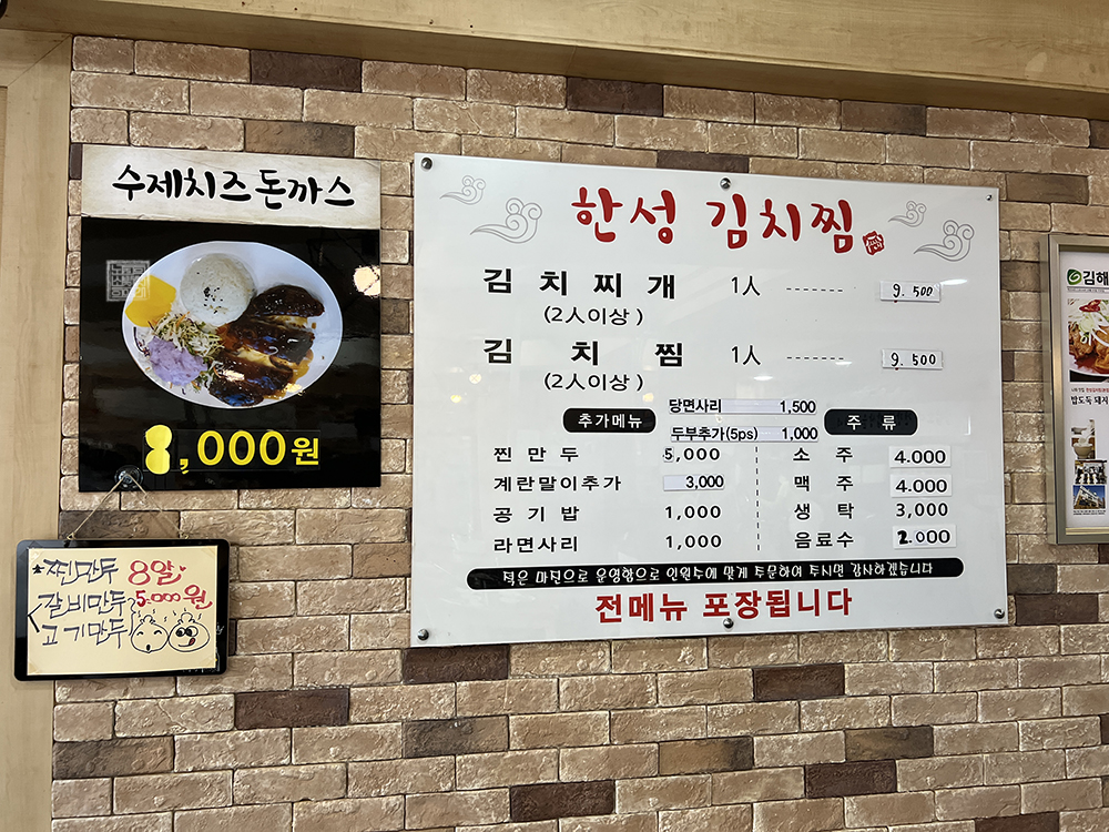 오랜만에 찾은 한성 김치찜은 역시 다른 가게와 마찬가지로 가격의 변동이 조금 있었다. 김해 한성 김치찜 본점을 처음 찾았던 2017년에는 김치찌개 1인 분이 7,000원 김치찜 1인 분이 8,000원이었지만, 현재는 모두 가격이 올라 김치찌개와 김치찜 1인 분이 9,500원으로 동일하게 책정되어 있었다. 요즘 물가를 생각한다면 어쩔 수 없었다.