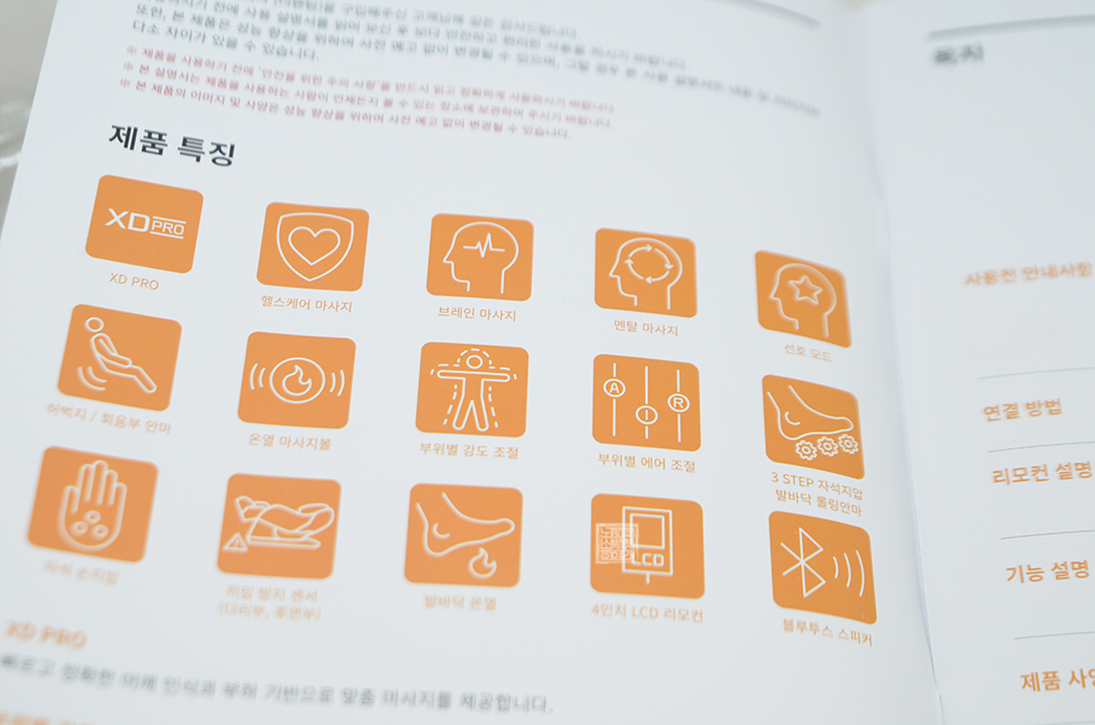 함께 받아볼 수 있었던 설명서를 본다면 제품이 가지고 있는 특징과 함께 어떤 모드의 마사지를 지원하고 있는지 한눈에 파악할 수 있다. 기본적으로 많은 사람이 사용하는 헬스케어 마사지부터 시작해서 앞서 말한대로 스피커를 통해 특정 배경음을 들으면서 마사지를 받을 수 있는 브레인 마사지 등 다양한 모드의 마사지를 제공했다.
