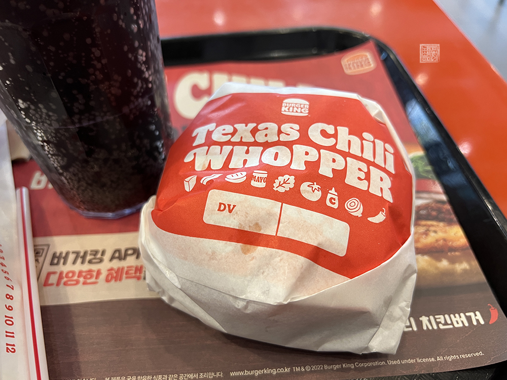 어제 한동안 내리던 장맛비가 잠시 소강상태를 보인 점심때를 맞아 버거킹을 찾았다. 처음에는 평소처럼 몬스터 와퍼 세트를 주문해서 먹으려고 했지만, 이번에 버거킹에서 새롭게 나온 텍사스 칠리와퍼에 잠깐 흥미가 생겨서 이번에는 신 메뉴를 한번 먹어보기로 했다. 칠리소스가 들어간 제품이다 보니 살짝 매콤한 맛이 딱 좋을 것 같았다.