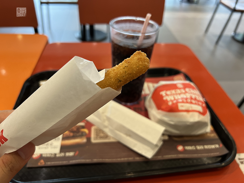 포스기로 버거킹 신 메뉴 텍사스 칠리와퍼를 주문할 때 세트 구성을 바꿀 수가 있었기 때문에 나는 감자 튀김 대신 치즈 스틱을 선택했다. 나는 포테이토 피자 같은 경우에는 입맛에 맞기 때문에 종종 먹지만, 햄버거와 함께 먹는 감자튀김은 이상하게도 손이 가지 않아서 가능하다면 치즈스틱을 바꿀 수 있다면 바꿔서 먹는다.