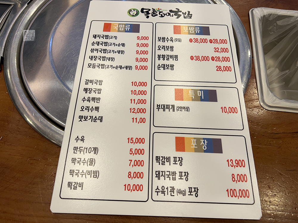 오랜만에 찾은 목촌돼지국밥은 모든 메뉴의 가격이 천 원이 올라 있었다. 처음 자리에 앉아 메뉴판을 받을 때 서빙을 하시는 아주머니 분이 "가격이 모두 천 원씩 올랐습니다."라고 안내를 해주셨는데, 2019년에 7천 원이 하던 국밥이 조금씩 가격이 오르기 시작해 오는 2022년을 맞아서는 거의 1만 원에 가까운 9천 원이 되어버렸다.
