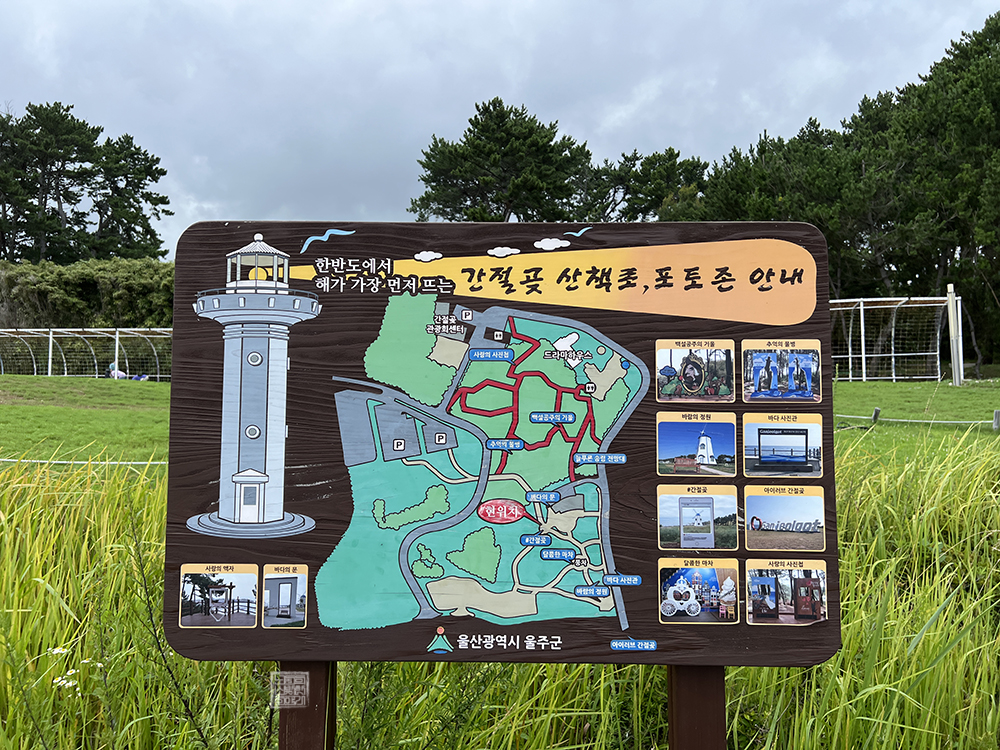 그렇게 천천히 산책로를 돌아보면서 다시 차를 주차한 곳으로 발걸음을 옮길 때 위 사진에서 볼 수 있는 간절곶 산책로와 포토존을 보여주는 팻말을 만날 수 있었다. 마음 먹고 간절곶 산책로를 돌려고 한다면 조금 더 크게 돌아볼 수도 있는데, 당일 하늘이 희한하게 한쪽만 파란 하늘이었기 때문에 나와 어머니는 파란 하늘 쪽만 걸었다.