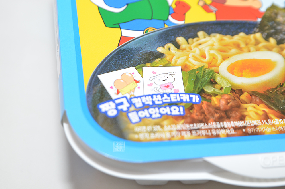 그리고 제품의 포장 용기를 본다면 액션가면 라멘에는 <짱구는 못말려>에서 볼 수 있는 짱구와 흰둥이를 비롯한 짱구 컬렉션 스티커가 들어가 있다는 것을 알 수 있다. <포켓몬스터>의 띠부띠부씰이 인기를 얻기 시작한 이후 다양한 띠부띠부씰이 제품과 동봉되는 경우를 종종 볼 수 있는데, <포켓몬스터>만큼 히트한 건 찾아보지 못했다.