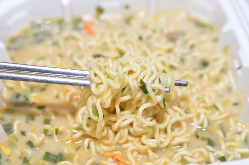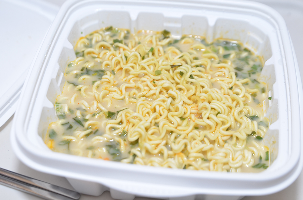 나는 면이 살짝 꼬들꼬들한 것을 좋아해서 700W 전자레인지를 기준으로 2분을 돌렸는데 딱 원하는 스타일로 완성된 것을 알 수 있었다. 라멘의 모습을 본다면 다음과 같다!