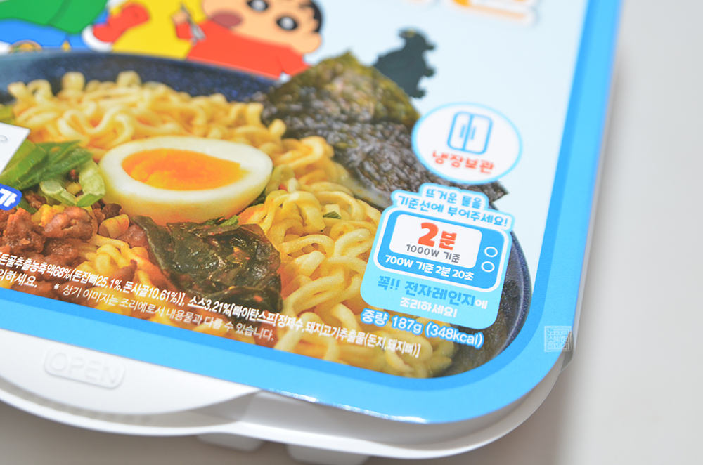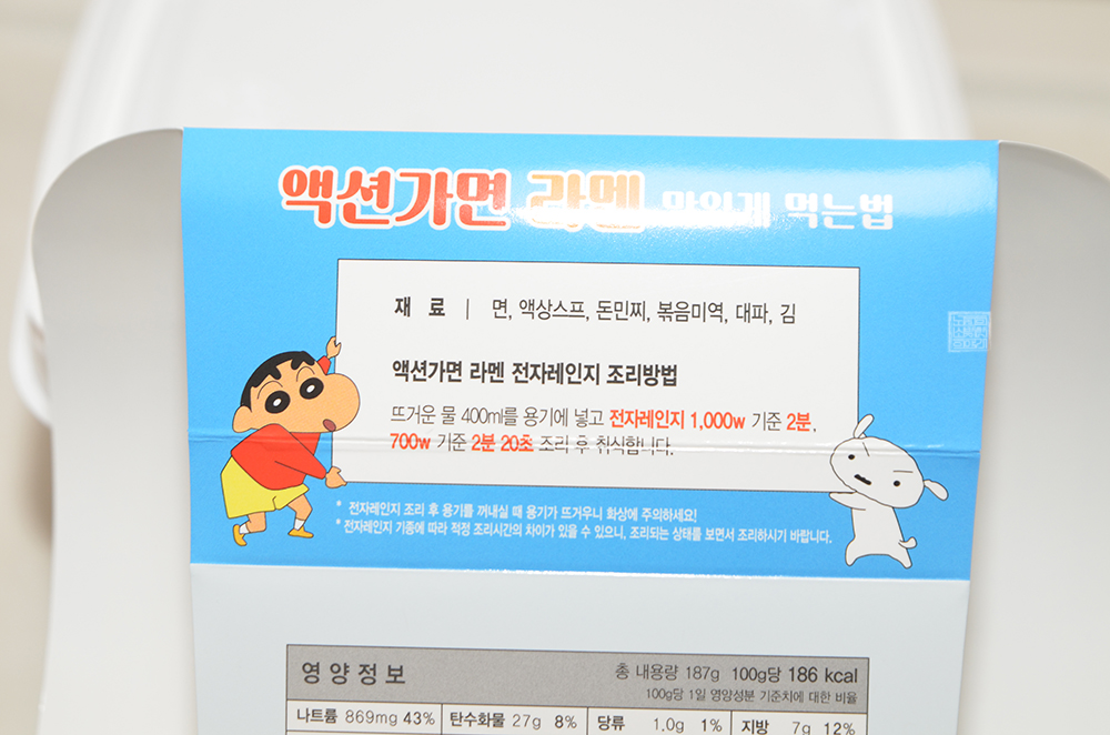 처음에 나는 생각 없이 전자레인지 '시작60초/확인' 버튼을 한 차례 누른 이후 액션가면 라멘을 꺼냈다가 면이 덜 익은 걸 보고 '어? 내가 뭘 잘못했나?' 싶어서 당황했다. <짱구는 못 말려> 액션가면 라멘은 뜨거운 물 400ml를 용기에 넣은 이후 전자레인지 1,000W 기준 2분, 700W 기준 2분 20초 조리를 한 이후 먹어야 하는 제품이다.