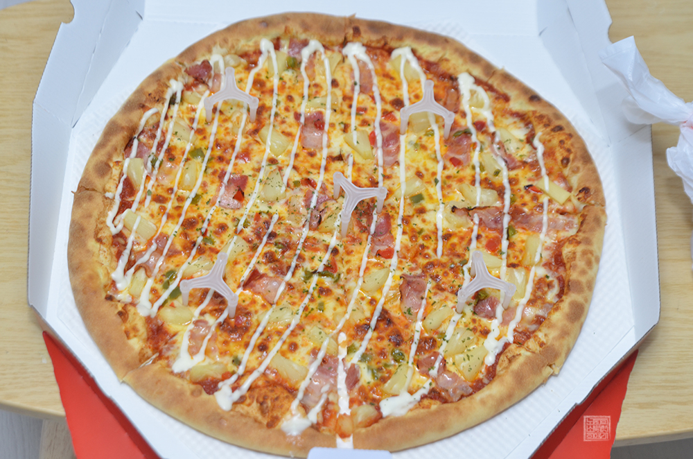 그런데 하와이안 피자가 속한 카테고리는 XXXL 사이즈가 기본이었기 때문에 나는 당연히 다른 프랜차이즈 브랜드에서 주문할 때 받아볼 수 있는 L 사이즈라고 생각을 했다. 하지만 막상 받아본 피자는 그 크기가 18인치(지름 약 45cm)이다 보니 상당히 컸다. 타 부가 메뉴가 없더라도 2~3명이서 충분히 배부르게 먹을 수 있는 크기였다.