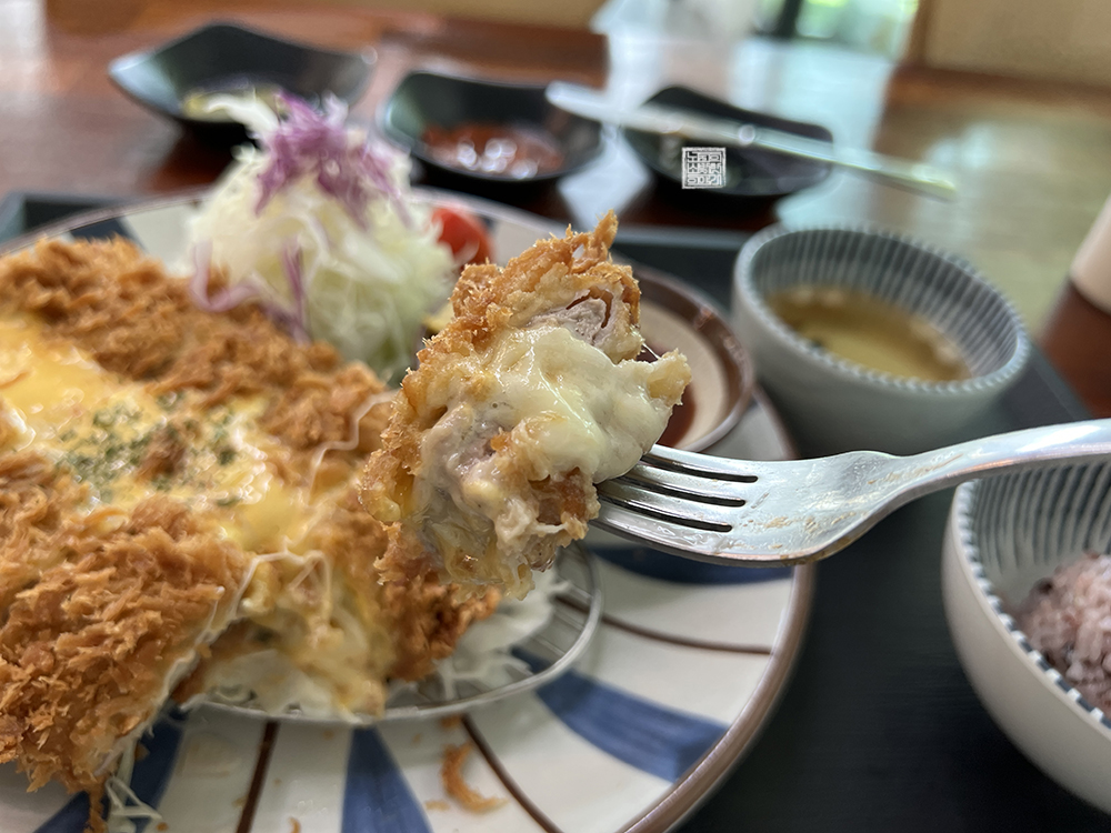 칼질을 하는 대신 입으로 적당히 베어 먹는 방법도 있지만, 나는 구강 상태가 그렇게 좋지 않은 탓에 부드러운 음식이 아닌 이상은 베어 먹기가 쉽지 않다. 그래서 처음에는 조금씩 잘라먹으려고 하다가 그냥 귀찮아서 잘라져 있는 돈까스를 한 개씩 통째로 먹었다. 치즈 돈까스의 치즈는 사진에서 볼 수 있듯이 두 가지 정도가 들어간 듯했다.