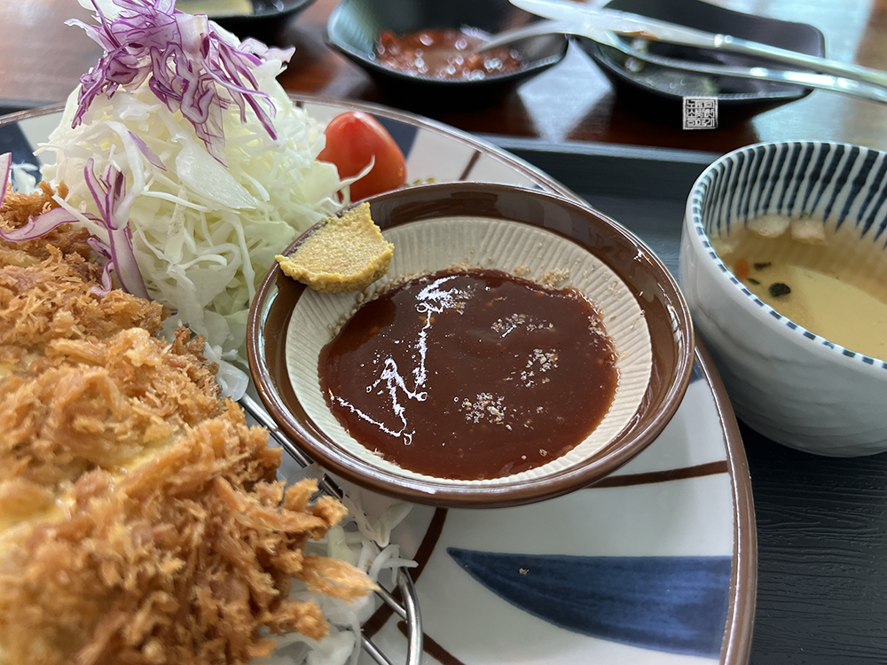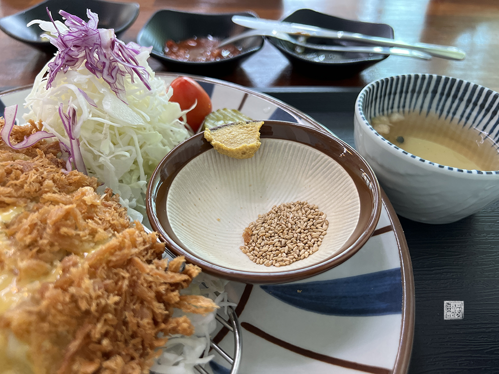 깨는 곧바로 돈까스 소스를 뿌린 이후 겨자를 섞어서 먹는 게 아니라 먼저 테이블에 위치한 작은 홍두깨로 깨를 곱게 분쇄해준 이후 돈까스 소르를 뿌려서 겨자와 섞어주면 훌륭한 돈까스 소스가 완성된다.