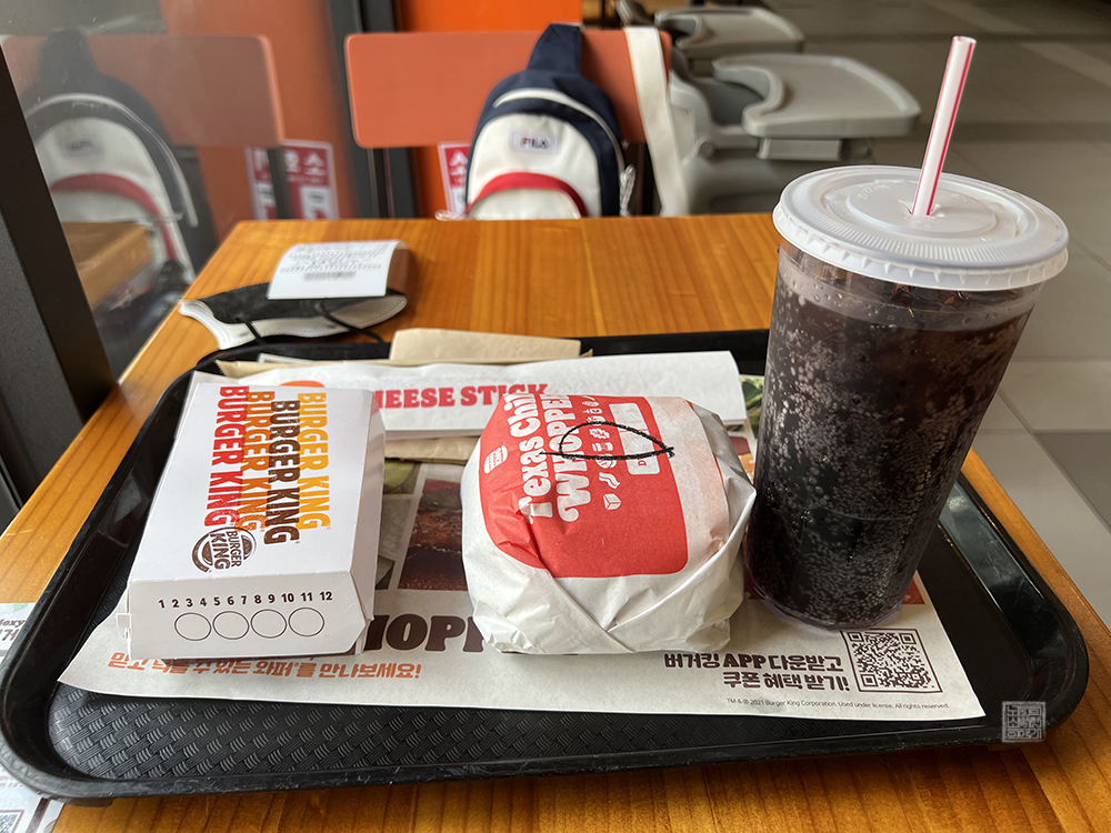 당일에는 그것을 눈치채지 못했던 나는 치즈스틱을 추가로 함께 주문했다. 버거킹 매장에서 치즈스틱은 딱 1천 원에 먹을 수가 있기 때문에 햄버거를 매장을 찾아 직접 먹을 때 치즈스틱을 먹지 않으면 왠지 손해 보는 느낌이었다. 그리고 감자튀김 같은 경우에는 5백 원을 더 내고 텍사스 칠리프라이로 교환하는 선택지를 선택했다.