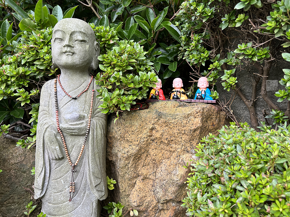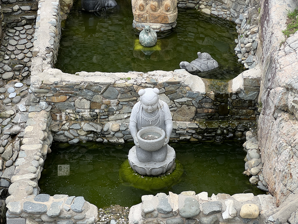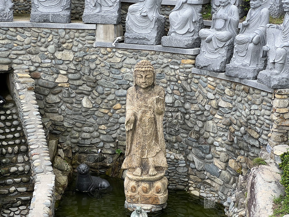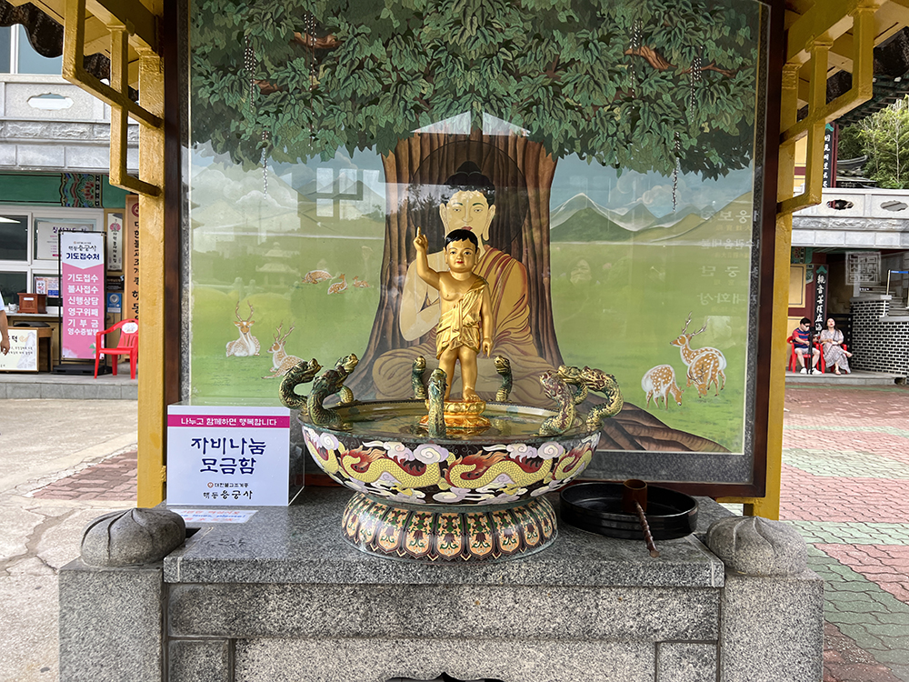 본격적으로 용궁사 내부로 들어가는 길에는 위 사진에서 볼 수 있는 불상과 돈을 받기 위한 대야(?)를 들고 있는 조각상을 만날 수 있다. 해동용궁사는 어떤 소원이든 한 가지를 들어준다고 말하는데, 어머니는 동전 던지기를 여러 차례 시도해 기어코 한 개를 대야 안으로 넣는 데에 성공했다. 하지만 어머니가 빌었던 소원은 이루어지지 않았다.