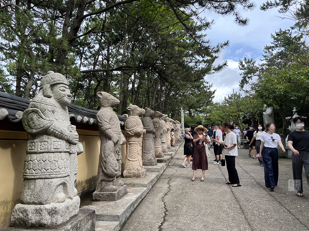 그리고 차를 주차한 이후 5분 정도 걸으면 용궁사의 모습을 볼 수 있는 것도 아니었다. 여러 상점이 있는 상점가(?)를 지나 십이지신 석상을 지나 제법 걸어야 해동용궁사를 만날 수 있었다. 당일 방문했던 날이 다소 흐리기는 해도 날씨가 무척 더운 여름이다 보니 연신 땀을 흘리면서 손선풍기를 틀고 이동을 해야 했다.