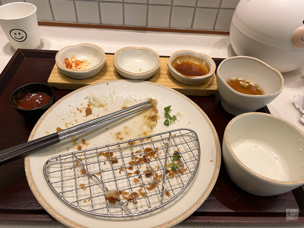 그런데 테이블을 본다면 돈가스를 소금에 찍어 먹을 수 있도록 소금이 준비되어 있었는데, 테이블 위나 돈가스를 받았을 때 소금을 따로 덜어먹을 수 있는 공간이 없었다. 당시에 나는 소스 접시를 하나 새로 달라고 해야 할지 고민하다가 단무지를 돈가스 접시로 옮긴 이후 단무지 접시에 소금을 갈아서 뿌린 이후 생돈카츠와 함께 먹었다.