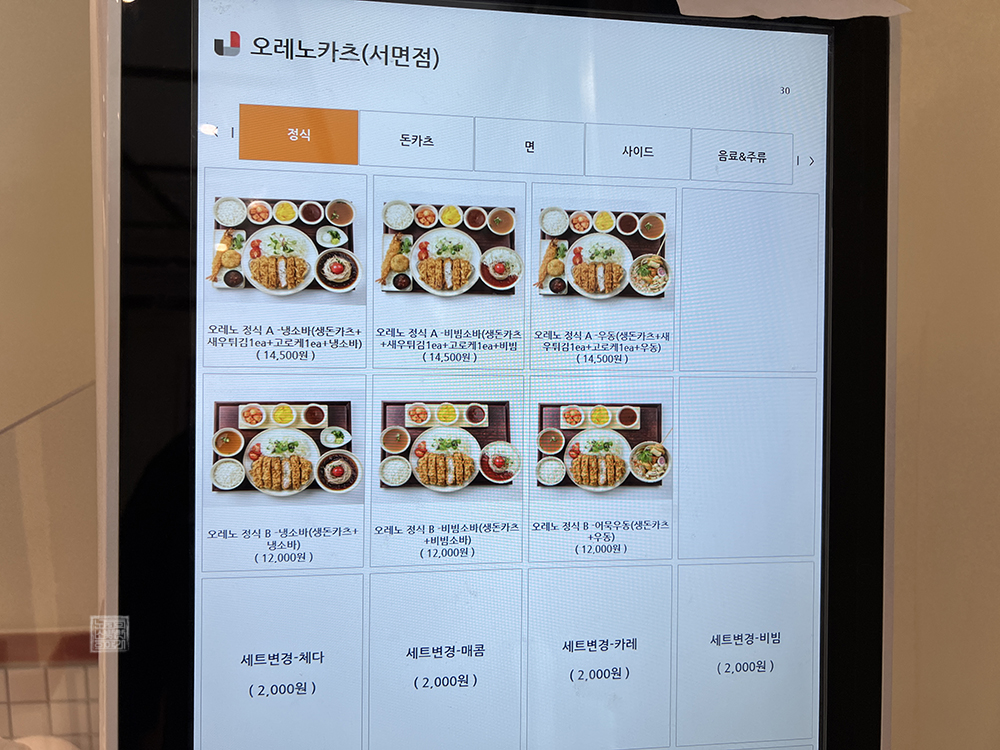 오레노카츠에서는 가게 내부에서 따로 메뉴판을 제공하지 않는다. 대신 키오스크를 이용해서 주문할 때 정식부터 돈카츠, 면, 사이드 등을 골고루 확인한 이후 주문하거나 혹은 가게밖에 배너 형태로 놓여 있는 메뉴를 미리 살펴본 이후 가게에서 주문할 수 있다. 당시 내 뒤에 기다리는 사람이 있어 키오스크 메뉴판을 골고루 찍지 못했다.