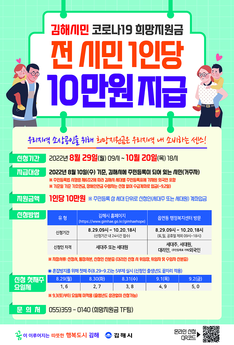 22년 8월 29일(월) 오전 9시부터 김해시는 홍태용 김해시장이 선거 공략으로 내세웠던 김해시민 희망지원금 10만 원 지급 신청을 받는다. 원래는 조금 더 일찍 희망지원금을 시민들에게 지급할 예정이었지만, 예산과 의회의 일정 문제로 8월 말로 연기되어 추석이 있는 9월을 맞아 김해 시민들이 필요할 때 희망지원금을 받을 수 있도록 한 듯하다.