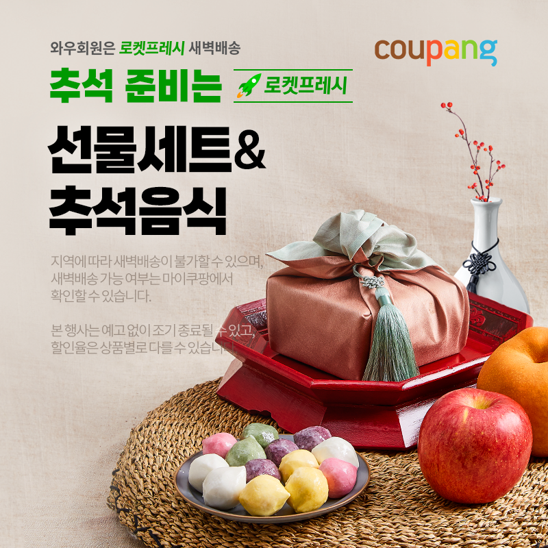 조금 더 다양한 추석 선물 세트 정보가 알고 싶다면, 아래에 첨부한 배너를 통해 쿠팡에서 판매하고 있는 여러 추석 선물 세트를 살펴볼 수 있도록 하자. 쿠팡 와우 회원은 로켓프레시 새벽 배송을 받을 수 있기 때문에 소고기 선물 세트 혹은 떡/베이커리 같은 제품도 상하는 일 없이 곧바로 다음날 새벽에 받아 납품을 하거나 전달할 수 있을 것이다.