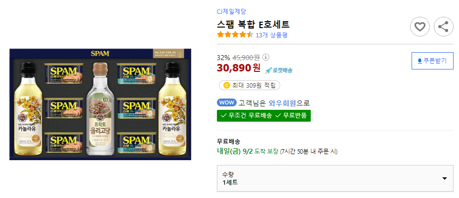 혹시 쿠팡에서도 이마트와 마찬가지로 이러한 스팸 복합 2호 선물 세트를 저렴하게 팔고 있지 않을까 싶어 검색을 해보았는데, 쿠팡에서는 이마트에서 취급하고 있는 스팸 복합 2호 선물 세트는 확인할 수 없었다. 대신 아래 사진에서 볼 수 있는 스팸 복합 E호 세트를 약 3만 원에 판매하고 있었는데, 대형 유통사마다 취급하는 게 다른 듯했다.
